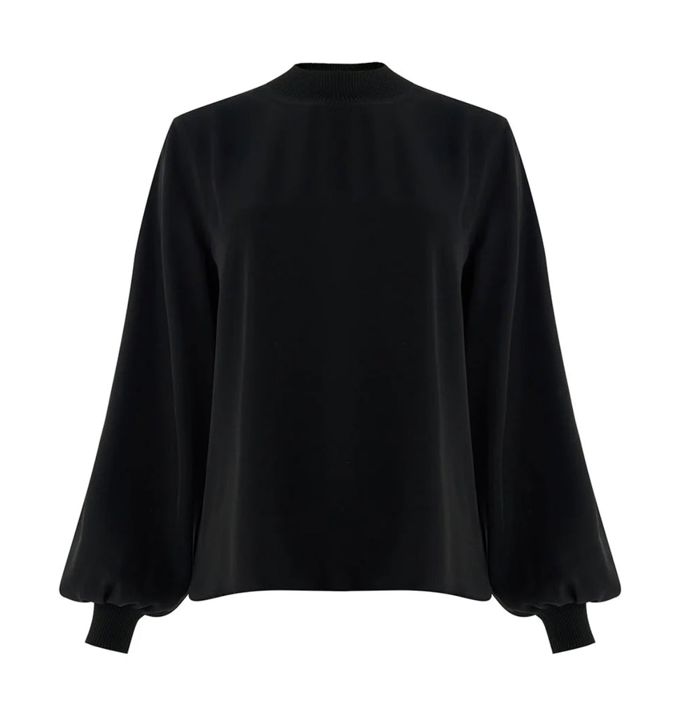 Minimal Drama, maximum impact. With a high neck, long sleeves, and a relaxed shape, the Joelle Blouse is an essential black staple designed for ease and elegance. Pairs beautifully with tonal bottoms or statement accessories.